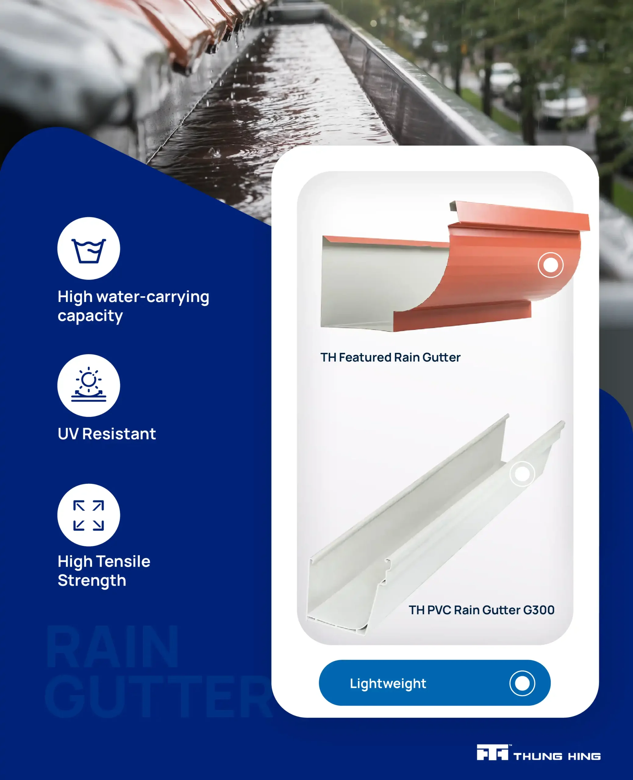 Installing a reliable gutter system is a smart investment. Over time, the protection and peace of mind it offers make it well worth the cost. Thung Hing Rain Gutter Series have a range of recommended gutters; TH Featured Rain Gutter and TH PVC Rain Gutter G300.