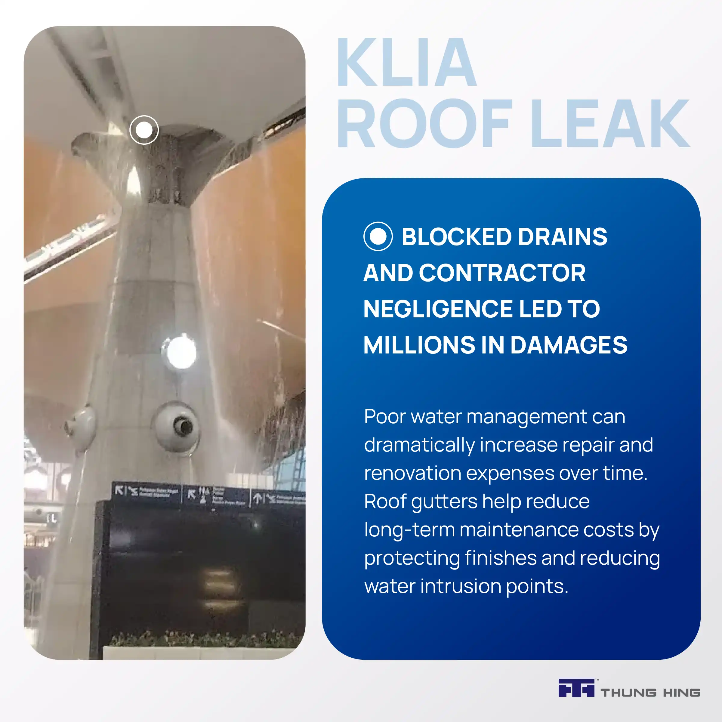 The KLIA 2025 roof leak illustrates how even critical infrastructure can be vulnerable when drainage is compromised and how ensuring water is quickly and effectively channeled away protects not just the building but its users as well. – source