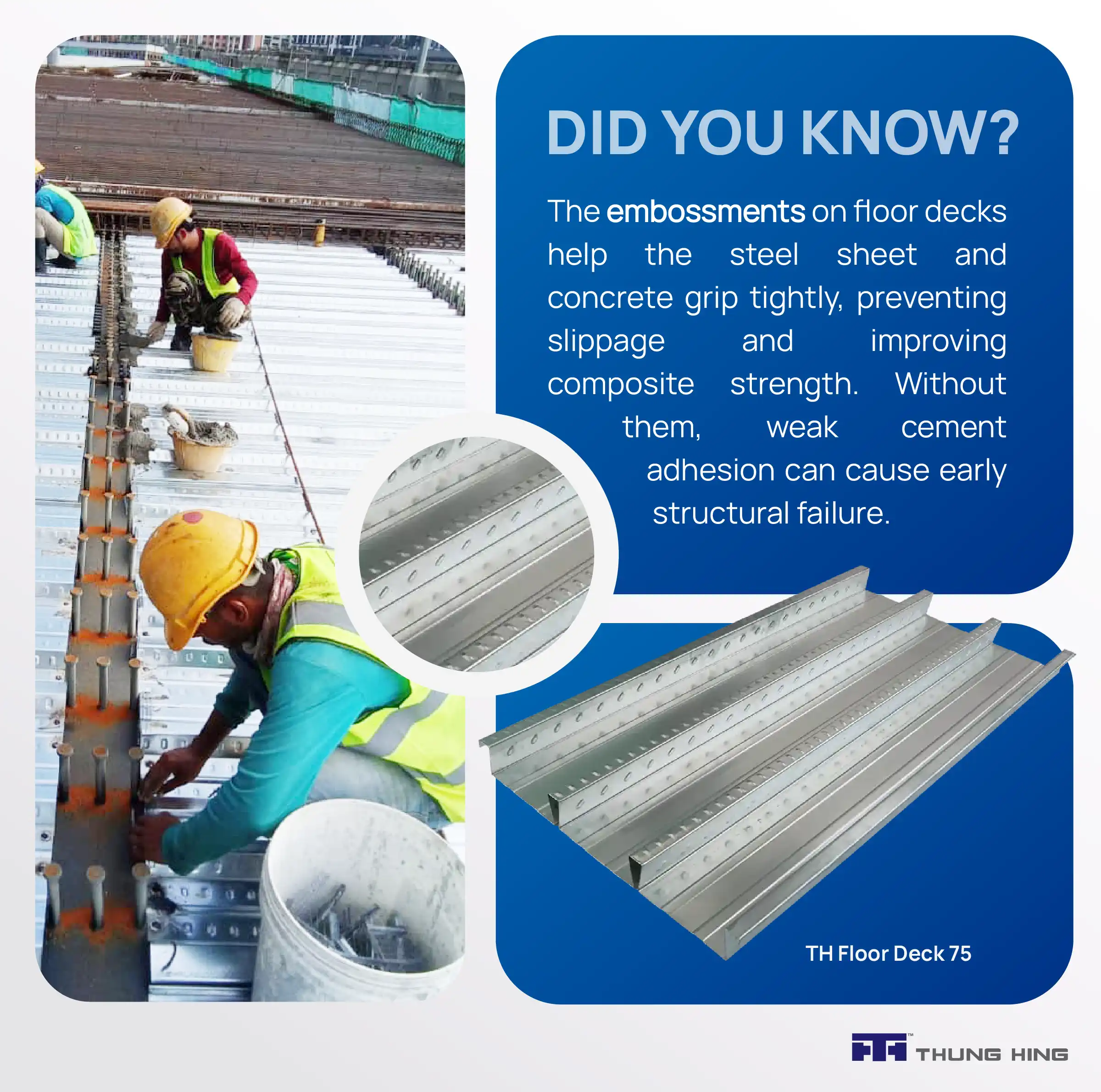 Looking for a good composite floor decking? The TH Floor Deck 75 (Structural Decking) by Thung Hing is a way to go. It combines steel and concrete to create a floor system that’s both sturdy and efficient. Its smart design uses less concrete and a thinner slab, which means the floor is lighter, costs less, and works perfectly for modern buildings.